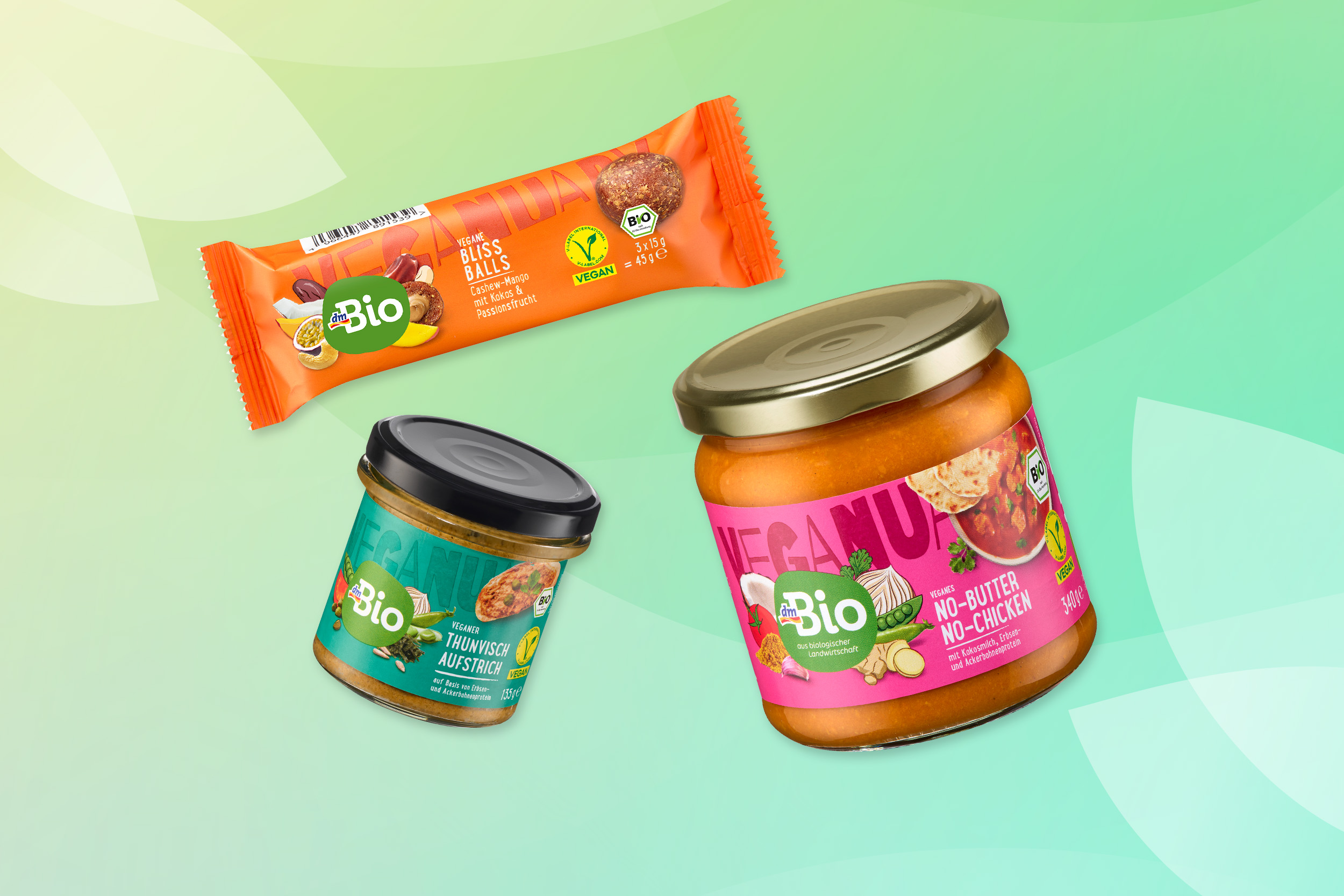 Zu den Highlights im dm Veganuary 2026 Sortiment zählen unter anderem die dmBio Bliss Balls Cashew-Mango und Pistazie, ein veganer Tassenkuchen Banana Bread, Waffelriegel im Kinder-Bueno-Stil, Mais-Reis-Chips sowie herzhafte Produkte wie Tofu mit Curry, vegane Cevapcici, vegane Ravioli mit Bolognesefüllung oder ein dmBio No Butter No Chicken. Neu dabei ist außerdem ein veganer Thunvisch-Aufstrich auf Basis von Erbsen- und Ackerbohnenprotein.